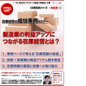 セミナー 在庫経営の成功事例セミナー(製造業) 開催日 2017年10月11日 開催場所 グランフロント大阪タワーB34階 アイル大阪本社セミナールーム テーマ 製造業の利益アップに繋がる在庫経営はこれだ! セミナー詳細 1.事例ベースで考える在庫の仮設 ・製造業の在庫の特長(材料、仕掛... 2017.10.11 セミナー在庫最適化