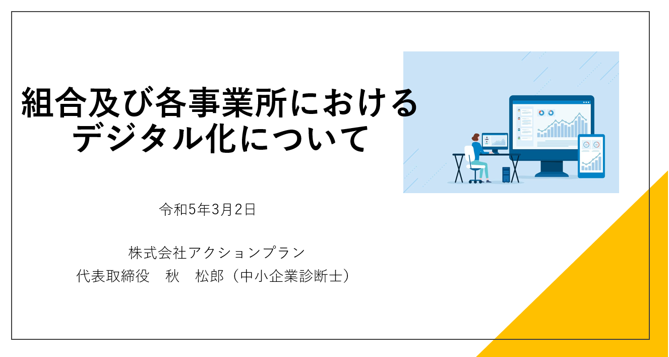 アプリ活用 組合運営と事業所のデジタル化について 2023年03月02日(火)に、大阪府中小企業団体中央会のセミナー講師派遣事業で、大阪府建具協同組合様の理事会で「組合および各事業所におけるデジタル化」のセミナー講師を担当しました。 開催日 2023年07月10日(土) 19時00分~20... 2023.03.03 アプリ活用セミナー